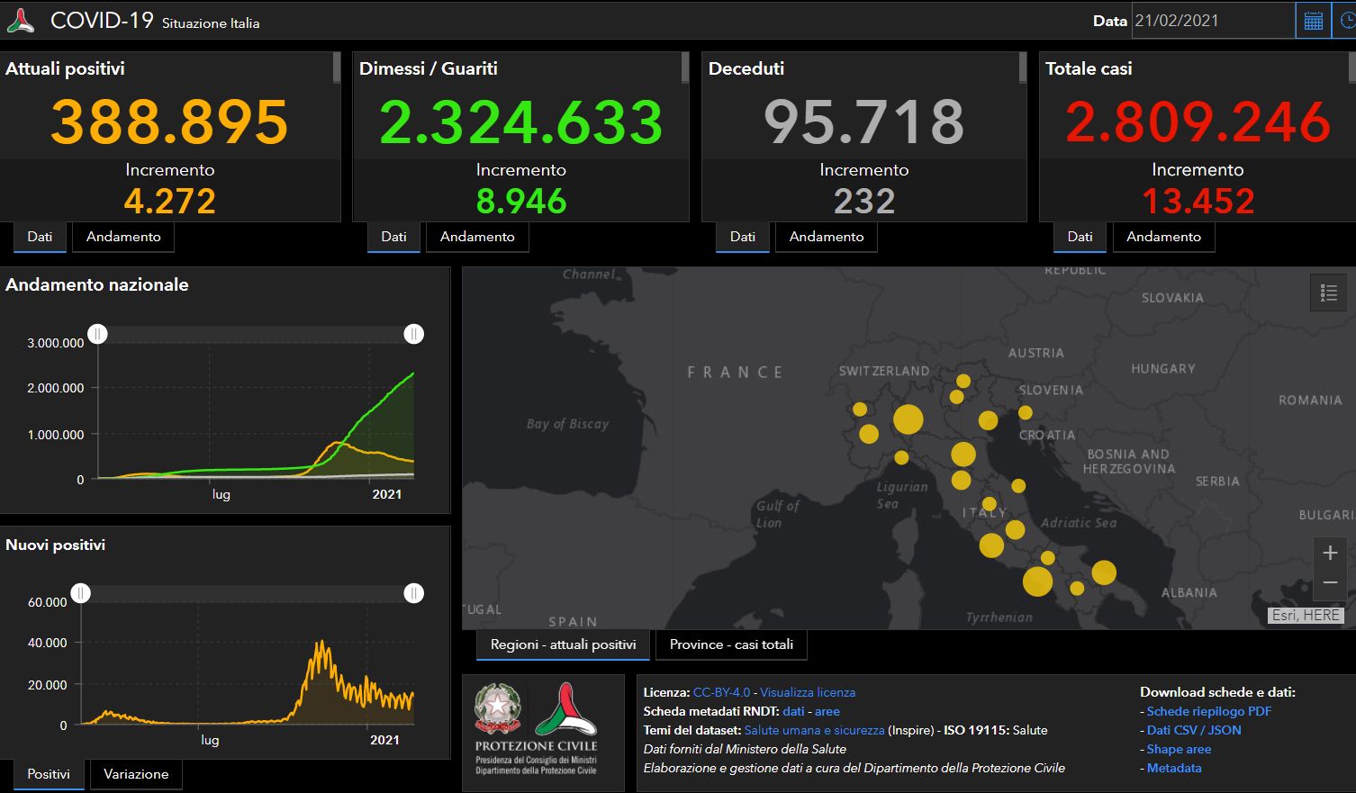 ROMA (ITALPRESS) – Sono 13.452 i nuovi casi di Coronavirus in Italia (ieri 14.931) a fronte di 250.986 tamponi effettuati su un totale di 38.058.939 da inizio emergenza. E’ quanto si legge nel bollettino del Ministero della Salute – Istituto Superiore di Sanità di oggi. Nelle ultime 24 ore sono stati 232 i decessi per un totale di 95.718 vittime da inizio pandemia. Con quelli di oggi diventano 2.809.246 i casi totali di Covid in Italia. Attualmente i positivi sono 388.895 (+4.272 rispetto a ieri), 368.997 le persone in isolamento domiciliare. I ricoverati in ospedale con sintomi sono 17.804 di cui 2.094 in terapia intensiva. I dimessi/guariti sono 2.324.633 con un incremento di 8.946 unità nelle ultime 24 ore.