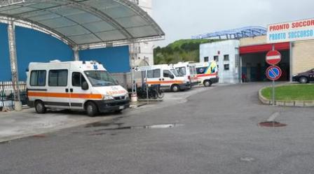 Ambulanze davanti l'ospedale di Crotone, una delle zone interessate dalla scossa di magnitudo 5.1 che ha interessato la zona jonica tra le province di Catanzaro e Crotone, 5 aprile 2014. ANSA / CLEMENTE ANGOTTI