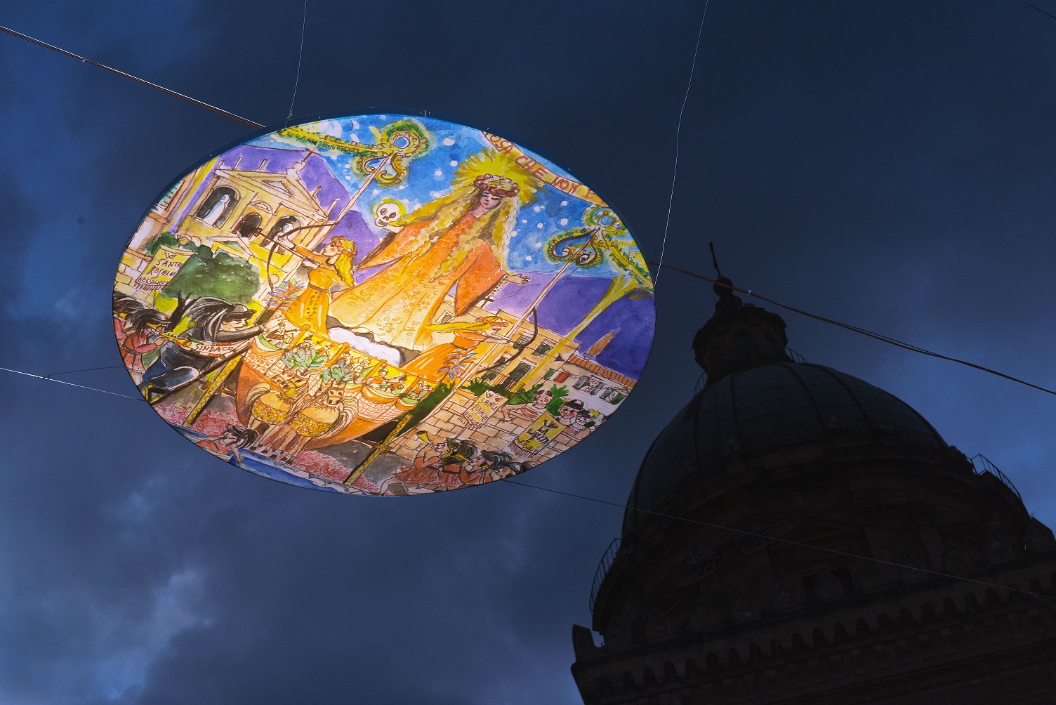 Cubi e cerchi sospesi su sagrato Cattedrale comaggio a Santa Rosalia