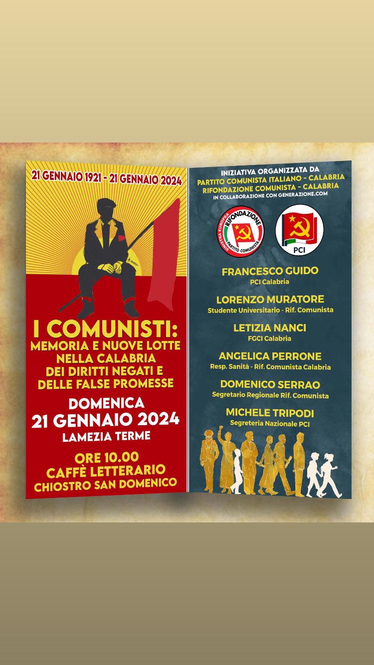 Il 21 gennaio a #Lamezia Terme i comitati regionali del Partito della Rifondazione Comunista e del PCI – Partito Comunista Italiano organizzano una manifestazione pubblica che oltre a commemorare una data storica per la nascita del Partito Comunista d’Italia nel 1921 a #Livorno, si propone di rilanciare l’iniziativa politica dei comunisti sul territorio regionale attraverso una rinnovata unità di intenti.