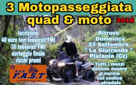 Si svolgerà domenica 23 settembre 2018 la III edizione della “Motopasseggiata quad e moto” con partenza prevista alle ore 9:00 da Acquavona Platania in direzione dell’abbazia di Corazzo nel Comune di Carlopoli. Il percorso sarà affrontato su strade sterrate bianche sempre nel massimo rispetto per la natura. Una volta giunti a destinazione a tutti gli iscritti sarà offerto un Break a conclusione del quale si proseguirà in direzione della “La Giurranda” attraverso un percorso medio di 60 km, sempre attraverso strade bianche sterrate del Reventino.