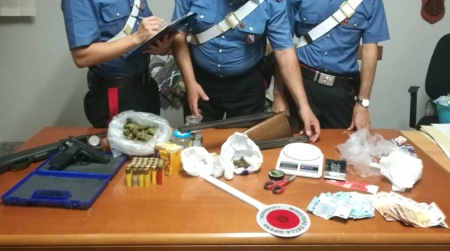 I fatti risalgono alle ore 19:00 circa quando i Carabinieri, nel corso di un mirato servizio di osservazione, hanno notato giungere i due giovani nei pressi di un casolare di campagna, nella disponibilità del ragazzo, ubicato in località Sant’Andrea. A quel punto i militari hanno atteso che il ragazzo aprisse il lucchetto che assicurava la chiusura del portoncino di ingresso al casolare e, una volta entrati, sono intervenuti e bloccato i due giovani. La loro presenza in quel luogo è stata giustificata da quanto rinvenuto all’interno del casolare dove, occultati in uno zaino, vi erano 310 grammi di marijuana mentre in due vasetti in vetro sono stati trovati complessivamente 34 grammi di cocaina. Sempre all’interno della costruzione rustica i Carabinieri hanno trovato 210 grammi di sostanza da taglio del tipo mannite, materiale atto al confezionamento dello stupefacente, due bilancini di precisione e la somma contante di 930 euro in banconote di piccolo taglio, ritenuto provento di pregressa attività delittuosa. Un controllo più accurato dello stabile, infine, ha consentito di rinvenire anche un fucile a canne mozze, 25 cartucce calibro 20 a palla e 24 cartucce calibro 20 a pallini.