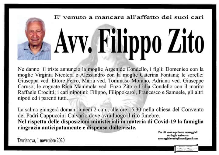 E’ morto all’età di 85 anni l’avvocato Filippo Zito. Combatteva da anni contro un tumore.Il decesso ieri sera alle 21,30 . I funerali oggi alle 15,30 alla chiesa dei Cappuccini. Pippo Zito era una personalità molto conosciuta in città. Avvocato e politico di lungo corso era stato negli anni 80 uno dei leader della DC ricoprendo anche l’incarico di vice sindaco della città. Alla famiglia Zito le condoglianze della redazione di Approdo Calabria.