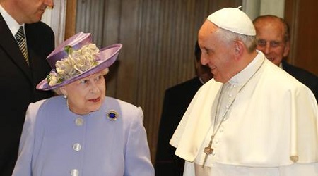 Il colloquio privato tra la Regina Elisabetta e papa Francesco, alla presenza di un interprete del personale vaticano, è durato all’incirca 20 minuti. Il colloquio si è tenuto nello studio presso l’Aula Paolo VI, una stanza di piccole dimensioni. Al suo arrivo in Vaticano, la regina si è immediatamente scusata con il Pontefice per il ritardo di 23 minuti: “Ci dispiace per l’attesa, stavamo avendo un piacevole pranzo con il presidente Napolitano”. L’atmosfera dell’incontro è stata descritta dai presenti molto “cordiale”, “distesa”, quasi familiare, con il Papa e la Regina entrambi “sorridenti”.