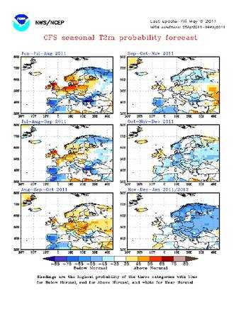 Per quanto riguarda invece le mappe Noaa, le previsioni sono espresse in termini di medie trimestrali (giugno-luglio-agosto, luglio-agosto-settembre, agosto-settembre-ottobre ecc.) estese anche fino alla fine del corrente anno. Da queste previsioni si osserva che la prossima estate (ma anche l’inizio autunno) sarà probabilmente più calda del normale soltanto sull’Europa centro settentrionale (e centro orientale per l’inizio autunno), mentre il sud Europa, ed in particolare Spagna, Italia e parte meridionale della penisola balcanica avranno probabilmente temperature inferiori al normale anche in autunno. Quanto alle precipitazioni, l’Europa nord orientale potrebbe essere soggetta a situazioni siccitose superiori sia ai valori normali estivi che a quelli normali autunnali, mentre, viceversa l’Europa meridionale, compresa l’Italia potrebbe avere un’estate piovosa o comunque più piovosa del normale: una situazione che si potrebbe protrarre anche per l’inizio dell’autunno e tornare verso la normalità solo in pieno autunno e all’inizio dell’ inverno.
