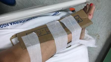 Una delle foto choc pubblicate dal "Corriere della Calabria" a corredo dell'inchiesta condotta dal giornalista Pietro Bellantoni mostra una fasciatura ortopedica realizzata con un cartone al posto del gesso al pronto soccorso dell'ospedale di Reggio Calabria, 31 luglio 2018 ANSA/ PER GENTILE CONCESSIONE DEL CORRIERE DELLA CABRIA