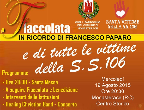 L’Associazione “Basta Vittime Sulla Strada Statale 106” con il patrocinio dell’Amministrazione comunale di Monasterace ha organizzato il prossimo 19 agosto una Fiaccolata in ricordo di Francesco Paparo e di tutte le vittime della S.S.106 in Calabria. L’iniziativa avrà luogo nel centro storico di Monasterace a partire dalle ore 20:30 quando, nella Chiesa Matrice, inizierà, presieduta dal Rev. Parroco Don Nicola Commisso, la Santa Messa. A seguire avrà luogo la fiaccolata che terminerà con gli interventi istituzionali previsti e solo dopo ci sarà il concerto della Healing Cristian Band.