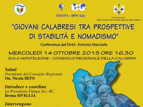 La Fidapa (Federazione Italiana Donne Arti Professioni Affari) e l’Associazione universitaria New Deal presentano una conferenza formativa dal titolo “Giovani Calabresi tra Prospettive di Stabilità e Nomadismo”, con il noto sociologo calabrese Antonio Marziale, presidente dell’Osservatorio Nazionale sui diritti dei minori, rivolta principalmente ai giovani del nostro territorio troppo spesso costretti ad emigrare in cerca di un futuro migliore. L’incontro si svolgerà mercoledì 14 ottobre alle ore 16:30 presso la sala Monteleone del Consiglio regionale. I lavori saranno coordinati da Bruna Siviglia, presidente Fidapa sez. RC, con la partecipazione del presidente del Consiglio regionale, Nicola Irto. Anche l’Università Mediterranea di Reggio Calabria sarà fra le istituzioni a supporto dell’iniziativa e sono, infatti, previsti gli interventi del Prof. Francesco Manganaro, direttore dipartimento DiGiEc e del Prof. Domenico Nicolò, coordinatore del corso di studi di scienze economiche.