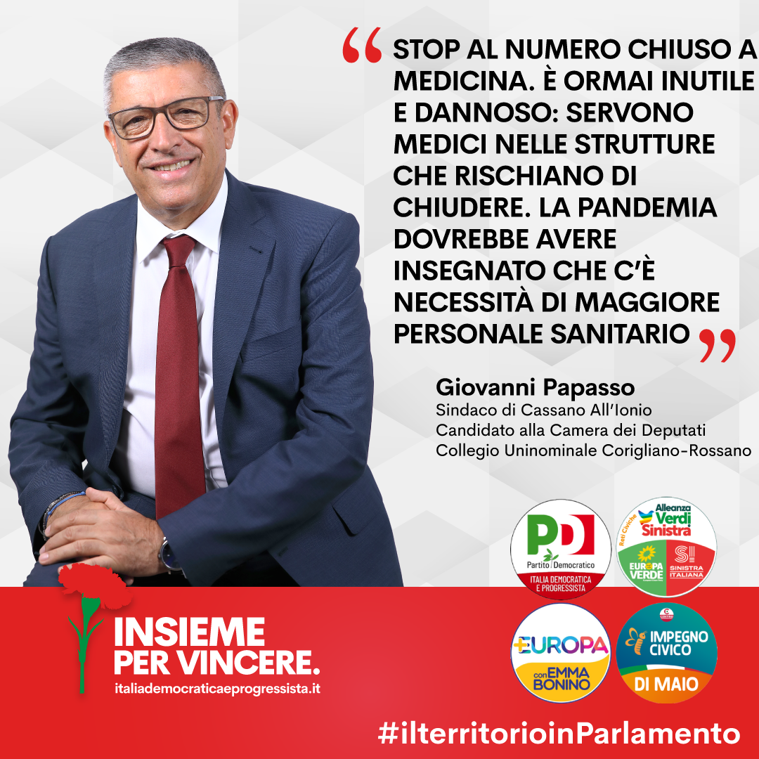 Nel corso del mio tour elettorale ho incontrato molti medici alcuni dei quali ricoprono anche ruoli apicali e mansioni di coordinamento. Ascoltando i loro bisogni e parlando delle necessità di tutto il comparto è emerso che è ormai diventata improcrastinabile la fine del numero del numero chiuso alla facoltà di medicina perché c’è bisogno di assumere nuovi professionisti per garantire i servizi ai cittadini.