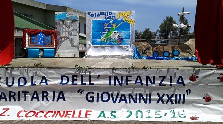 Alla presenza di Mons. Albino Caratozzolo, del Dirigente Scolastico Luciano Ardissone, del vice parroco Don Domenico Loiacono e di un folto pubblico i bambini della sezione “Coccinelle”, che continueranno a settembre il loro percorso didattico nella Scuola Primaria, hanno interpretato un simpatico musical ispirato alla favola di “Peter Pan”allestito con cura dalle maestre Maria Luisa Pagano, Angela Nasso, Letizia Zimbello, Antonella Romeo.