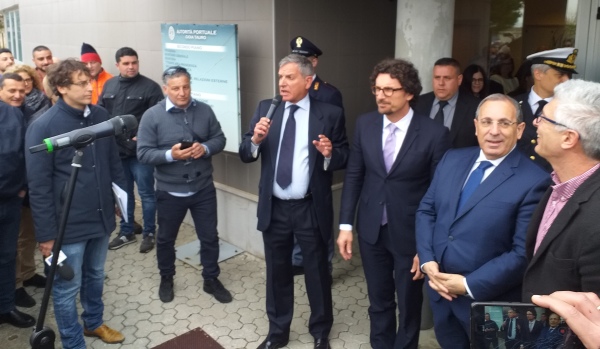 Quest’ultimo ha parlato prima di lui nella comunicazione ai lavoratori, nel giardino dell’Autorità portuale punteggiato anche di palchetti per un bagno di folla che non c’è stato, e l’ha seguito al tavolo della conferenza stampa per precisare “che la partita non è ancora vinta, perchè accanto al transhipment dobbiamo pensare ad altro”. Una dottrina abbottonata a cui Toninelli si è attenuto, deviando soltanto per dire che “oggi festeggiamo perché comincia il rilancio del porto”, lasciandosi sfuggire rivolto ai lavoratori che “il governo ha fatto una mediazione complicata”, precisando – rispondendo poi alla domanda di Approdonews – che “si è trattato solo di accompagnare le parti a parlarsi”. La cessione delle quote da Contship alla società Til del gruppo Msc, comunque, interrompe un conflitto che per il commissario Andrea Agostinelli “durava da anni”, determinando il ministro a riconoscere a lui e al prefetto Michele Di Bari che gli sono stati accanto in conferenza, “il grande merito di aver contribuito alla pace sociale seguendo una trattativa che si è conclusa senza gli annunciati licenziamenti”.