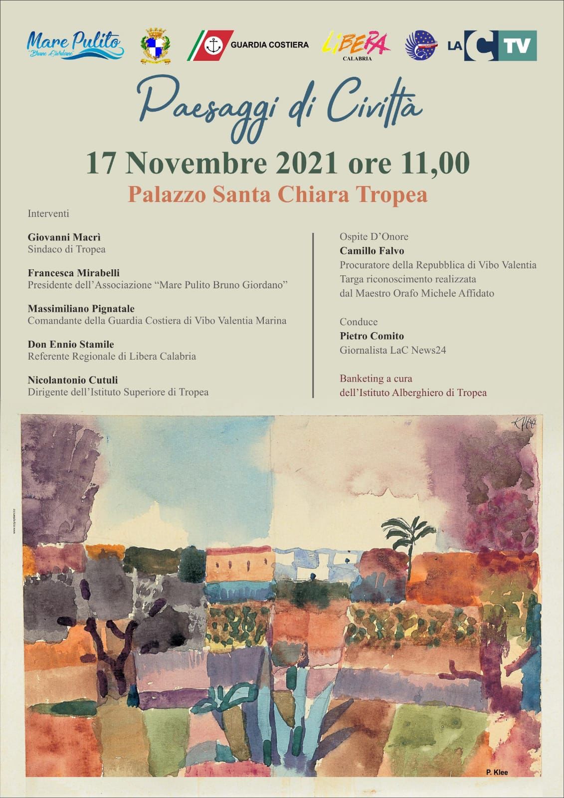 A Tropea, il prossimo 17 novembre dunque, nel palazzo Santa Chiara alle 11, proprio la presidente Mirabelli insieme al sindaco della città, Giovanni Macrì, al comandante della Guardia Costiera di Vibo Valentia marina, Massimiliano Pignatale, al referente regionale di Libera, don Ennio Stamile ed al dirigente dell’Istituto superiore Nicolantonio Cutuli parlerà di “paesaggi di civiltà”. Questo il titolo della bella iniziativa su ambiente, civiltà e legalità, appunto.