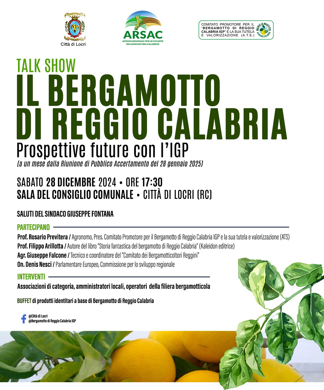 Si è finalmente conclusa la lunga querelle sul Bergamotto di Reggio Calabria con l’approvazione definitiva dell’IGP (Indicazione Geografica Protetta) e del relativo Disciplinare e ci si prepara alla Riunione di Pubblico Accertamento del prossimo 28 gennaio 2025 convocata dal Ministero dell’agricoltura. L’ultimo atto a conclusione dell’iter iniziato a giugno 2021 si terrà a Catanzaro alla Cittadella regionale su insistenza della Regione Calabria, nonostante il Comitato promotore avesse fatto esplicita richiesta di tenere l’evento a Reggio Calabria come giusto che fosse. E proprio a un mese dalla prossima importante riunione ufficiale, si terrà sabato 28 dicembre 2024 alle 17,30 a Locri presso l’aula del consiglio comunale il talk show “IL BERGAMOTTO DI REGGIO CALABRIA – Prospettive future con l’IGP” organizzato dalla Città di Locri nell’ambito delle manifestazioni di promozione e valorizzazione delle filiere agricole e agroalimentari di eccellenza sostenute dall’ARSAC. Gli ospiti del talk sono l’agronomo Rosario Previtera, presidente del “Comitato Promotore per il Bergamotto di Reggio Calabria IGP e la sua tutela e valorizzazione (ATS)”, il prof. Filippo Arillotta autore del libro “Storia fantastica del bergamotto di Reggio Calabria” (Kaleidon editrice), Giuseppe Falcone tecnico e coordinatore del “Comitato dei bergamotticoltori reggini”, l’on. Denis Nesci parlamentare europeo e membro, tra le altre, della “Commissione per lo sviluppo regionale”. Seguono gli interventi delle associazioni di categoria, degli amministratori locali, dei bergamotticoltori e degli operatori economici della filiera, degli appassionati del “frutto della salute”. Si parlerà naturalmente di Bergamotto di Reggio Calabria, delle sue origini e storia, del suo percorso secolare dal mondo della profumeria a quello più recente della nutraceutica del food e del wellness, della situazione del mercato locale e nazionale e naturalmente delle nuove prospettive di sviluppo grazie all’approvazione dell’IGP, tra crisi del comparto e richieste di prodotto fresco e derivati provenienti dall’estero, nonché del turismo e del potenziale distretto bergamotticolo. Non mancherà il buffet di prodotti identitari a base di Bergamotto di Reggio Calabria. Nell’occasione, come già fatto in precedenza nei mesi scorsi durante i vari incontri pubblici di animazione territoriale a sostegno dell’IGP, verrà distribuita copia dell’ultima versione del Disciplinare di produzione dell’IGP “Bergamotto di Reggio Calabria” approvato dal Ministero, in attesa della Riunione di pubblico accertamento del 28 gennaio prossimo che organizzerà alla Cittadella regionale il Comitato promotore dell’IGP per come previsto dal Regolamento comunitario e decreto ministeriale specifici. Viva soddisfazione espressa dall’assessore comunale all’agricoltura Giuseppe Arone: ”Nel ricco cartellone di eventi delle festività natalizie locresi e tra le produzioni di eccellenza da valorizzare con l’apposito progetto sostenuto dell’ARSAC, non poteva mancare il Bergamotto di Reggio Calabria, grande prodotto storico e identitario del territorio reggino e dell’intera Calabria. Tanto più adesso che si avvicina l’atteso obiettivo del riconoscimento ufficiale del marchio di qualità IGP, il cui iter è stato sostenuto sin dall’inizio e con forza dall’amministrazione comunale di Locri e da tantissimi sindaci della locride e dell’area grecanica, consapevoli dell’importanza rivestita della storica filiera bergamotticola che necessita finalmente di innovazione a tutti i livelli e di entrare finalmente nei circuiti internazionali dei prodotti di qualità”.