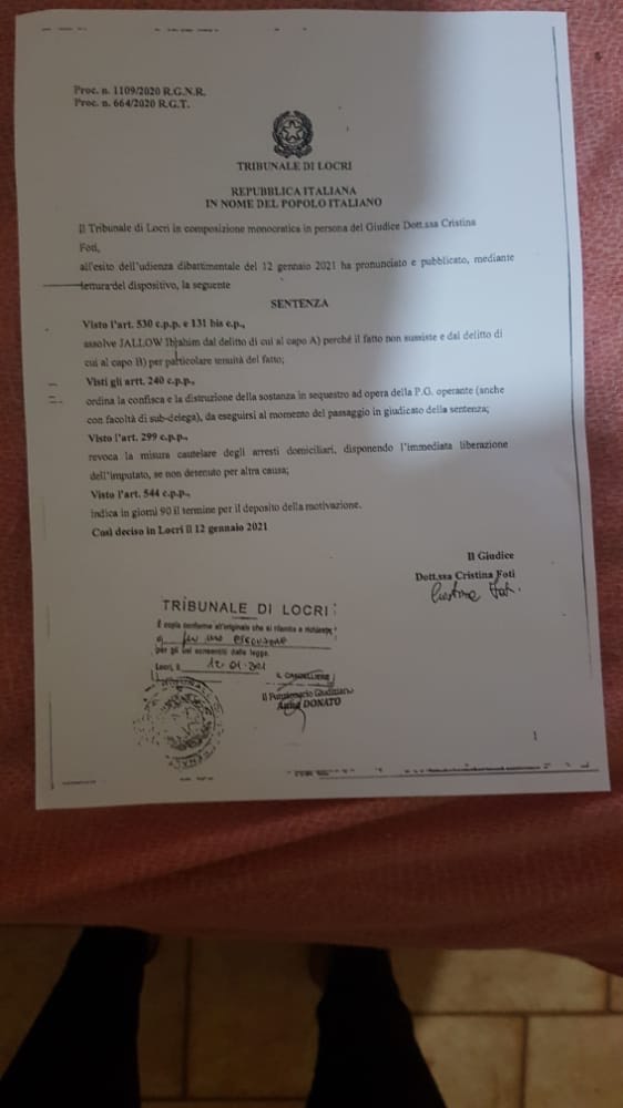 La sentenza è stata emessa dal Tribunale di Locri, nella persona del Giudice togato Dott.ssa Cristina Foti, che, a seguito di giudizio dibattimentale e dell’esame dei testi del P.M. e della difesa, ha dichiarato l’assoluzione di Ibrahim Jallow perché il fatto non sussiste per l’imputazione di detenzione di sostanza stupefacente a fini di spaccio ed ha disposto la revoca nei di lui confronti della misura cautelare degli arresti domiciliari ai quali lo stesso era stato sottoposto per tale vicenda, ordinando la sua immediata liberazione.