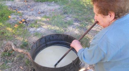 Prima di iniziare il procedimento della lavorazione del sapone, era abitudine diffusa “benedire” con formule di rito, allo stesso modo del pane, anche il composto che si andava a trasformare in sapone. Si tracciava il segno della croce e si buttava un pugno di sale marino dentro il fusto o la cardara, pronunciando la seguente frase: «Patri figghiu e spiritu santu ‘u poti crisciri n’attru tantu!». Appena il contenuto cominciava a bollire (Fig.2) si iniziava a versare piano piano la potassa, precedentemente sciolta in acqua fredda rimescolando di continuo con il bastone.