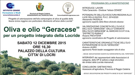 “Oliva e olio Geracese per un progetto integrato della Locride” è il titolo del convegno che si terrà sabato 12 dicembre alle 16,30 al Palazzo della Cultura di Locri. L’evento organizzato dall’Istituto Cenide e dall’Assessorato provinciale all’Agricoltura, si colloca nell’ambito del più ampio progetto pluriennale di “Valorizzazione dell’olio extravergine di oliva di qualità della fascia ionica reggina con particolare riferimento all’area della Locride”. Il progetto punta a rendere concretamente protagoniste le produzioni di eccellenza del comprensorio a partire dall’olivicoltura della Locride fondata sull’olivo “Geracese” o “Grossa di Gerace” che caratterizza il territorio ionico ed il tipico paesaggio olivicolo sia costiero che dell’entroterra. Dopo l’introduzione ai lavori da parte del direttore dell’Istituto Cenide Tullio Caracciolo, seguiranno gli interventi tecnici degli agronomi Alessandro Passalia su “Potenzialità dell’olivicoltura reggina alla luce della nuova P.A.C. 2014/2020”, Rosario Previtera su “Valorizzazione concreta dell’olivo e dell’olio “Geracese”: dalla “Comunità dell’olivo Geracese” al marchio D.O.P. e al Distretto rurale”, Antonio Lauro, capo panel assaggiatori di olii di oliva che illustrerà le “Caratteristiche organolettiche dell’olio extravergine di oliva Geracese”. A concludere i lavori, dopo gli interventi dei rappresentanti delle associazioni di categoria agricole e dei sindaci della Locride, sarà l’assessore provinciale Gaetano Rao. Durante la manifestazione è prevista sia la degustazione guidata degli oli monovarietali di Geracese del territorio sia la degustazione finale dei prodotti locali a base di oliva Geracese. Per Rosario Previtera, coordinatore del Progetto di valorizzazione “l’iniziativa ha visto una prima fase di animazione territoriale e di indagine accurata finalizzata a valutare le potenzialità del comparto olivicolo locale, l’interesse da parte degli agricoltori e dei frantoiani, nonchè le pre-condizioni per intraprendere l’iter necessario per ottenere la DOP per l’olio e l’IGP per l’oliva di varietà Geracese o Grossa di Gerace. Al convegno, si presenta l’associazione “Comunità dell’olivo Geracese” la quale potrà costituire un vero e proprio marchio d’area oltre ad essere il motore propulsivo del progetto in qualità di comitato promotore della DOP “Geracese” ed anche dell’omonimo Distretto rurale. Per quest’ultimo progetto occorrerà però la piena collaborazione di una buona parte dei comuni della Locride, per uno sviluppo integrato che parta proprio dall’agricoltura e dal turismo rurale”. Gaetano Rao, assessore provinciale all’agricoltura, crede nell’iniziativa sia in qualità di amministratore sia di imprenditore agricolo. “La Provincia di Reggio Calabria in questi anni si è impegnata intensamente per il comparto agricolo ed agroalimentare, riuscendo ad ottenere risultati importanti grazie alle innumerevoli iniziative promozionali e di sostegno alle imprese del territorio” sostiene Rao, per il quale “l’assessorato all’agricoltura continua a tutelare le aziende anche di fronte a situazioni di disagio o di calamità. Basti pensare alla risoluzione del “caso” olio IGP di Calabria per il quale la Regione aveva escluso le varietà di olivo tipiche del nostro territorio oppure alle azioni di sostegno rispetto alle calamità: l’ultima delle quali quella inerente la cenere vulcanica che sta danneggiando le produzioni agrumicole”. Dunque una nuova iniziativa con obiettivi di lungo periodo per la “Provincia bella e buona”.
