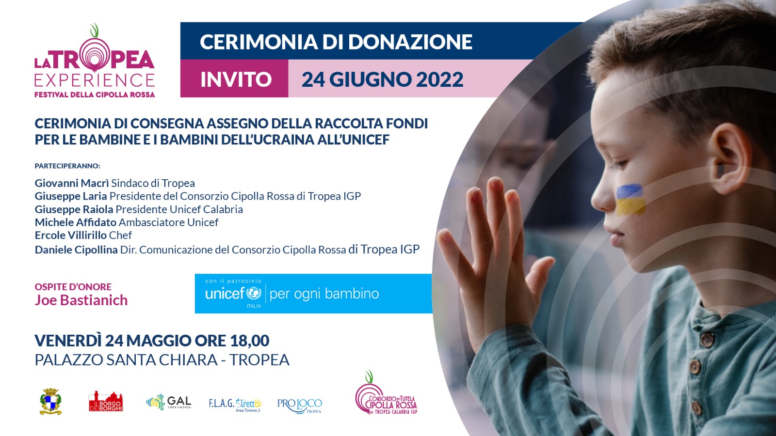 Raccolta fondi pro Unicef per le bambine ed i bambini dell’Ucraina. La cerimonia di consegna dell’assegno frutto della sensibilità e della solidarietà dimostrata in occasione della cena di gala a conclusione de La Tropea Experience – Festival della Cipolla Rossa, si terrà domani, venerdì 24 giugno, a Palazzo Santa Chiara. L’ospite d’onore sarà Joe Bastianich.