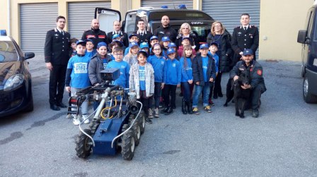 Si è poi passati alla dimostrazione di come si procede all’identificazione di una persona, dalla foto segnaletica, a come si prendono le impronte digitali. Hanno potuto vedere anche una dimostrazione di come si prendono delle impronte digitali su un’autovettura, tutto questo con l’ausilio del maresciallo Carmine Imparato, addetto ai rilievi in servizio al Nucleo Investigativo del Gruppo Carabinieri Lamezia. Si è poi passati alla lezione da parte del Nucleo Artificieri di Catanzaro, con la presenza del maresciallo Paolo Gigliotti, che ha spiegato ciò che fa quotidianamente, facendo poi vedere e toccare con mano ai ragazzi il robot utilizzato nei vari interventi per allarme di pacchi sospetti o bombe confermate. Terminata la parte teorica, i ragazzi hanno avuto modo di osservare una simulazione di intervento per un pacco sospetto, dal controllo iniziale a distanza con il successivo avvicinamento da parte del robot, per finire poi con far “brillare” il pacco (piccola esplosione vera!!!). Sempre all’esterno si è continuato con la lezione con il gruppo carabinieri cinofili di stanza a Vibo Valentia, che con il cane Sambo hanno spiegato e dimostrato anche loro ciò che quotidianamente è il loro impiego. Felicissimi i ragazzi poichè il pastore tedesco si è fatto accarezzare pazientemente…