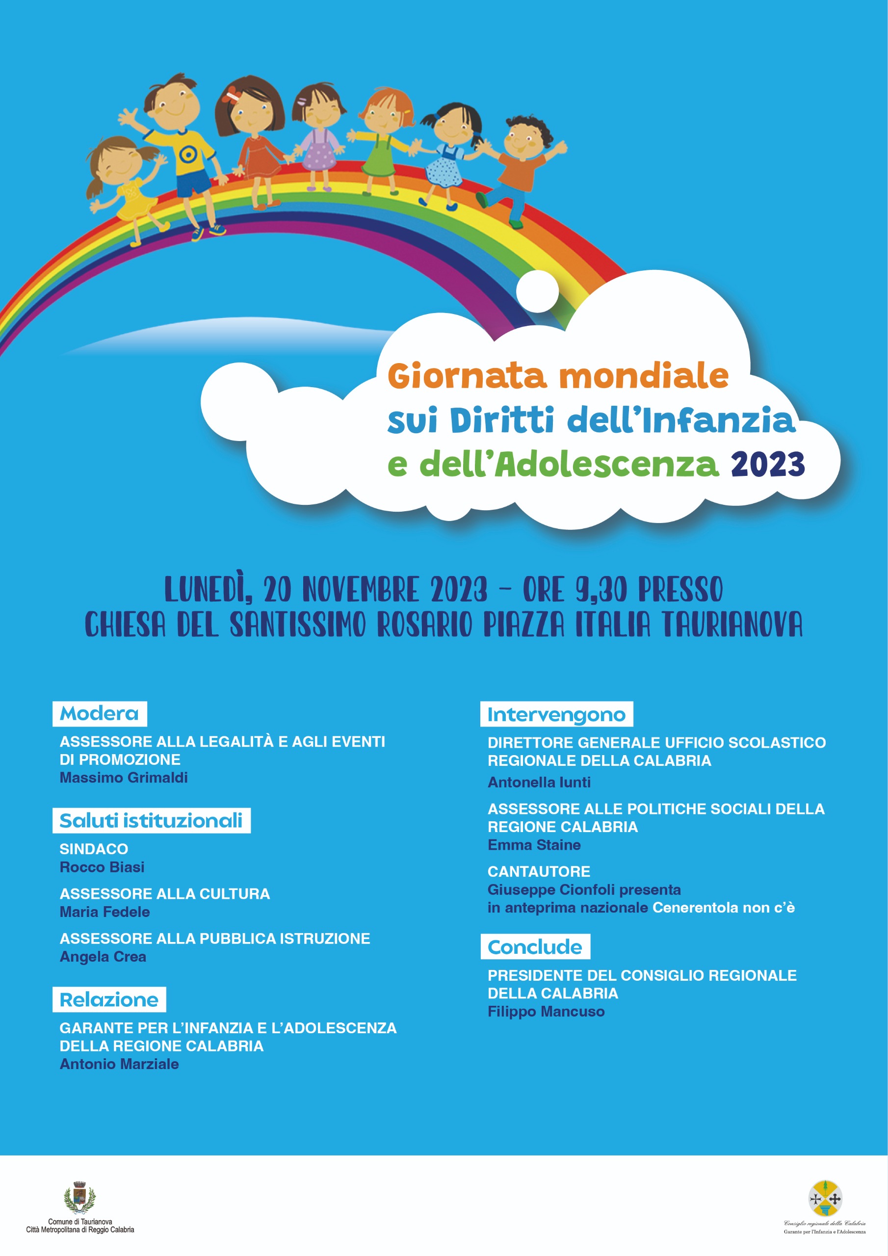 19 NOV 2023 – “Quella di domani, 20 novembre, non è una giornata di “celebrazione” della Dichiarazione Onu sui diritti dei minori, ma una giornata di “riflessione” sulle costanti e sempre più amplificate violazioni alle più elementari norme poste a salvaguardia della tutela dei più piccoli, ad ogni livello planetario”: è quanto dichiara il Garante per l’Infanzia e l’Adolescenza della Regione Calabria, nell’annunciare l’appuntamento di Taurianova, alle ore 9,30 presso la Chiesa del Santissimo Rosario.