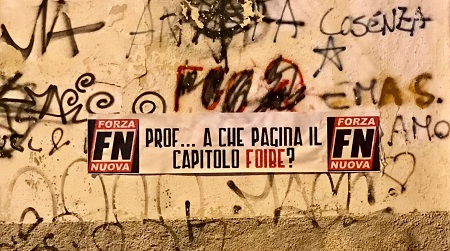 In occasione del Giorno del Ricordo, Forza Nuova Cosenza ha voluto commemorare le vittime delle foibe. Sono state effettuate decine di affissioni dinnanzi le maggiori scuole della provincia come: il Liceo Campanella di Belvedere sulla costa tirrenica, la ragioneria di Cosenza; gli scientifici di Rende e Spezzano Albanese e l’industriale di Rossano sulla costa ionica. I suddetti manifesti e striscioni riportavano la frase provocatoria: “Prof…a che pagina il capitolo FOIBE?”. Una frase che – nelle intenzioni dei militanti forzanovisti – è stata scelta per far scaturire il dibattito tra gli studenti dei suddetti istituti, circa l’immane tragedia della quale sono state vittime migliaia di nostri connazionali.