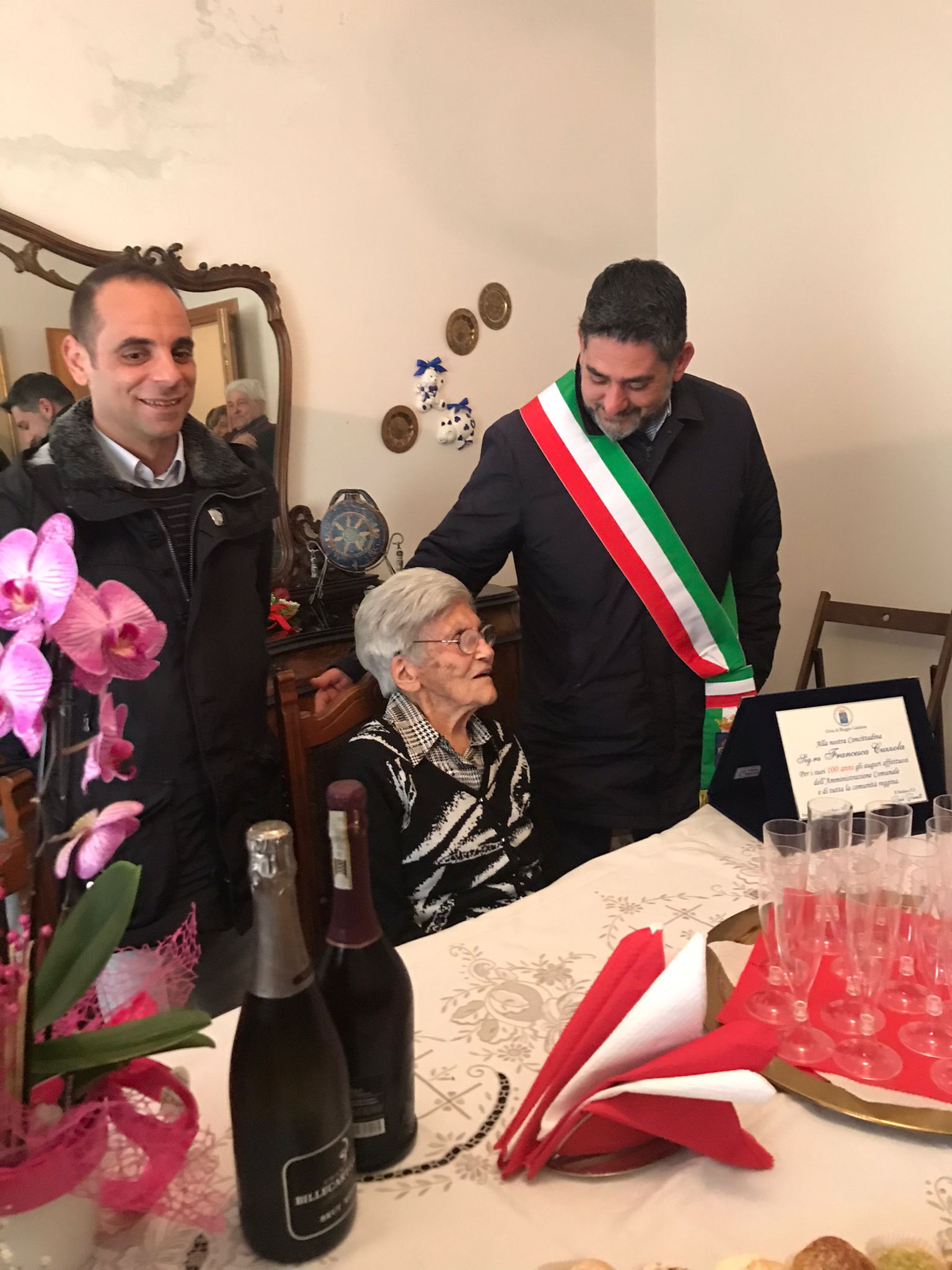 Tutta la comunità reggina festeggia i cento anni della signora Francesca Cuzzola. Un traguardo importante celebrato dalla nostra concittadina insieme alla famiglia e alle persone a lei più care. Alla prestigiosa ricorrenza anche l’amministrazione comunale ha voluto rendere il giusto e doveroso omaggio attraverso una targa celebrativa che il Sindaco f.f. Paolo Brunetti insieme al presidente del Consiglio comunale, Enzo Marra, ha voluto consegnare alla signora Francesca.