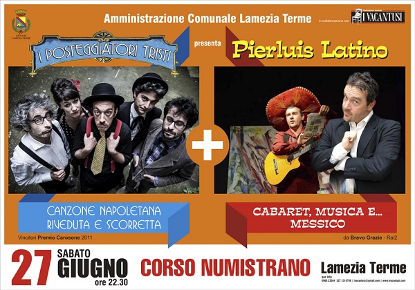 Grande spettacolo di musica e di cabaret sabato 27 giugno su corso Numistrano a Lamezia Terme. In occasione dei festeggiamenti dei S.S. Pietro e Paolo, patroni della città, l’Amministrazione comunale di Lamezia Terme, guidata dal sindaco Paolo Mascaro, e l’associazione teatrale “I Vacantusi”, sotto la direzione artistica di Nicola Morelli e Walter Vasta, hanno organizzato uno spettacolo all’aperto, gratuito e all’insegna del divertimento per grandi e piccini. Protagonisti della serata saranno infatti “I posteggiatori tristi”, un gruppo di musicisti cabarettisti che porteranno sul palco “La canzone napoletana riveduta e scorretta”, e Pierluis Latino, che si esibirà con uno spettacolo di cabaret, musica e… Messico. L’appuntamento è a partire dalle ore 22.30 su corso Numistrano a Lamezia.