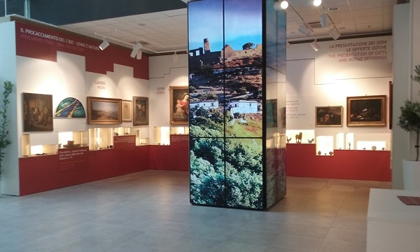 La mostra ha raccontato il tema del cibo nelle sue declinazioni sacrali e conviviali, dall’antichità ad oggi, attraverso un percorso espositivo dispiegato su quattro sezioni. Nella prima, intitolata “Il rito sacro del banchetto”, hanno trovato spazio significativi reperti, tra i quali un coltello sacrificale in ferro (machaira) proveniente dall’area sacra di Scrimbia ed esposto a Vibo Valentia, e un catino a vernice nera da Monasterace, che documentano il sacrificio agli Dei in età classica (l’uccisione della vittima e il vaso per raccogliere il suo sangue), atto imprescindibile per il pasto rituale in comune. La seconda sezione, “La presentazione dei doni e le offerte votive”, ha proposto, oltre al quadro di Recco, un ricco repertorio di ex-voto in terracotta, raffiguranti animali e frutti (tori, mele e melagrane) provenienti dai maggiori santuari greci della Calabria. Nella terza sezione, “Il procacciamento del cibo: uomo e natura”, lo spazio è stato dedicato al lavoro dell’uomo per il proprio sostentamento: dalla caccia alla pesca, dall’allevamento alla produzione. I reperti scelti svariano dagli ami da pesca in bronzo provenienti da Sibari al piatto da pesce a figure rosse da Crotone. L’ultima sezione, intitolata “Il convivio”, ha sviluppato il tema del banchetto inteso come appartenenza ad un gruppo sociale, all’interno del quale ritrovarsi per divertirsi e condividere le esperienze. I materiali archeologici esposti, a cui fa da sfondo il trittico di Vigliaturo “Festa sui prati”, costituiscono un intero set da simposio (cratere, brocca, coppe, mestoli, colini), con reperti dall’età greca arcaica a quella medievale. Accanto ad essi la ricostruzione virtuale tridimensionale del Triclinio della Casa del Drago di Kaulon, che i visitatori hanno potuto esplorare, con l’utilizzo di appositi occhiali, in uno schermo multimediale.