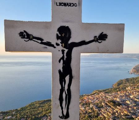 Il Caso. Un bambino crocifisso disegnato su una delle Tre Croci sul Monte Sant’Elia a Palmi: denuncia o provocazione?