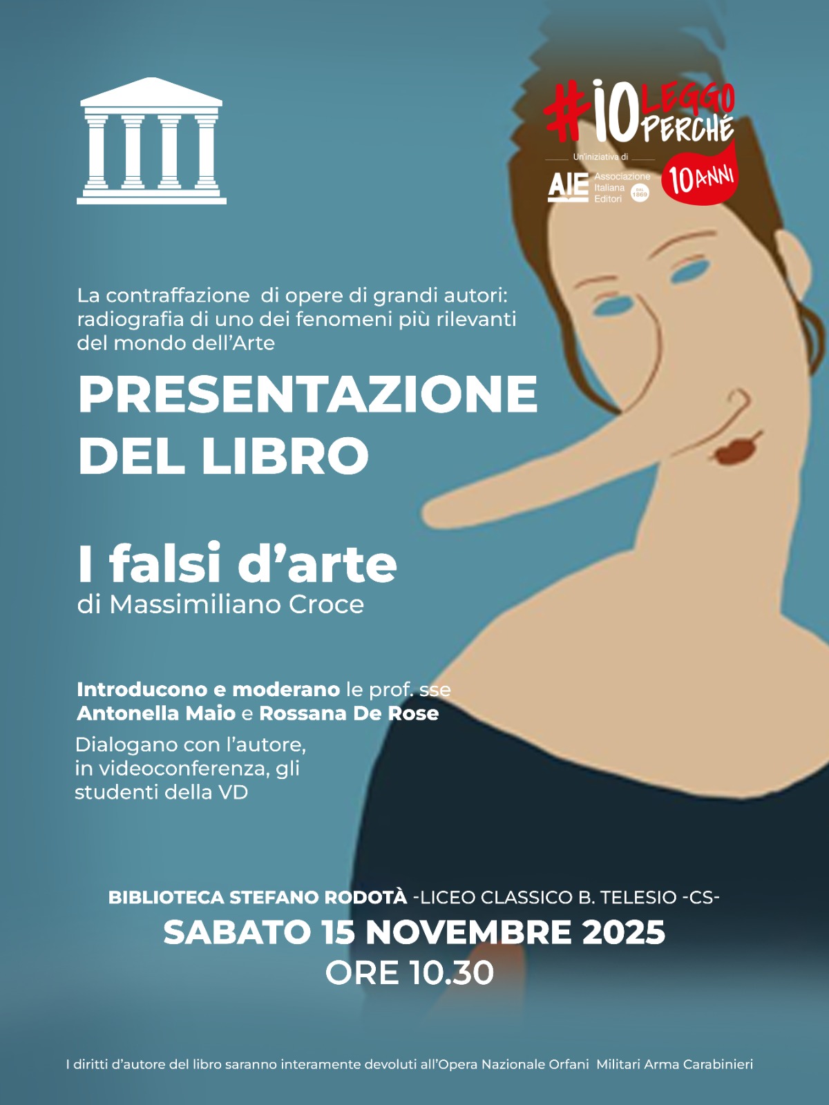 In chiusura il Capitano Croce ha voluto ricordare ai ragazzi come il fenomeno dei falsi d’arte sia strettamente collegato al traffico illecito di reperti archeologici, anch’esso un gravissimo danno al nostro patrimonio storico-culturale, spesso destinato a finire in musei esteri come “provenienza sconosciuta”. C’è una scarsa sensibilità dell’opinione pubblica sui beni culturali rispetto, ad esempio, all’ambiente. Il patrimonio culturale appartiene a tutti e deve essere protetto come parte della nostra storia e identità. Da qui l’importanza dell’evento, promosso nell’ambito dell’iniziativa #Ioleggoperché, “che si inserisce perfettamente nel nostro impegno per la promozione della lettura e della cultura come strumenti di cittadinanza attiva” ha spiegato la professoressa Antonella Maio promotrice dell’evento in quanto appassionata docente di storia dell’arte, affiancata nell’attività di preparazione delle classi dalla prof.ssa Rossana De Rose. Ma non si è trattato solo di storia dell’arte, bensì di etica, legalità e di economia. Capire infine il valore dell’autenticità e saper distinguere il vero dal falso sono competenze essenziali nella società contemporanea, alla base del pensiero critico che in un liceo classico trova l’humus più congeniale.