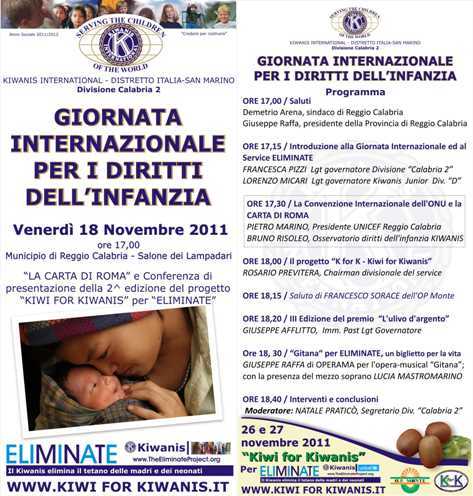 Si terrà venerdì 18 alle ore 17,00 presso il Municipio di Reggio Calabria nel salone dei Lampadari in occasione della “Giornata Internazionale dei diritti dell’Infanzia e dell’Adolescenza” la quale celebra ogni 20 novembre l’approvazione da parte dell’ONU della specifica Convenzione Internazionale sui Diritti dell’Infanzia e dell’Adolescenza, la conferenza di presentazione della seconda edizione del progetto “K for K – Kiwi for Kiwanis” che si svolgerà il 26 ed il 27 novembre prossimi. I kiwaniani di tutta la provincia si riuniranno per approfondire i temi relativi ai diritti dei bambini nell’ambito delle molteplici attività che in tutto il mondo il Kiwanis International svolge a favore dell’infanzia. Anche quest’anno il service internazionale per il quale i 300.000 kiwaniani nel mondo si attiveranno, sarà il progetto ELIMINATE che mira, in collaborazione con l’UNICEF, a debellare il tetano materno e del neonato (TMN) in 40 paesi del mondo. I kiwaniani della Divisione “Calabria 2” del Kiwanis ed il suo Luogotenente governatore Francesca Pizzi, finanzieranno ELIMINATE per l’acquisto dei vaccini anche grazie al progetto “K for K – Kiwi for Kiwanis”: i kiwi offerti gratuitamente dalla OP Monte di Polistena verranno venduti presso stand appositamente allestiti e a scopi benefici nelle piazze e nei centri commerciali di Reggio Calabria, Villa San Giovanni, Campo Calabro, Siderno, nei giorni 26 e 27 novembre. “Il progetto mondiale di service ELIMINATE è una sfida” sostiene Francesca Pizzi “e per questo occorre la collaborazione di tutti. Abbiamo già iniziato con la sponsorizzazione del parte dell’opera-musical “Gitana” di Operama i cui spettacoli in tutta Italia ed all’estero promuoveranno ELIMINATE e consentiranno di devolvere parte degli incassi al service. Con “K for K”, che si terrà il 26 e 27 prossimi contiamo di ripetere il successo dello scorso anno. Riteniamo che ELIMINATE si coniughi perfettamente con la celebrazione del 20 novembre della Giornata internazionale dei diritti dell’infanzia, in quanto garantirà a migliaia di bambini nel mondo il diritto alla vita”. Nell’incontro odierno intitolato “La Carta di Roma e conferenza di presentazione della seconda edizione del progetto “Kiwi for Kiwanis” si prevedono i saluti del sindaco Demetrio Arena e del presidente della Provincia Giuseppe Raffa. Seguirà l’introduzione della luogotenente Francesca Pizzi e del luogotenente del Kiwanis junior Lorenzo Micari. Della “Convenzione internazionale dell’ONU e della Carta di Roma” parleranno Pietro Marino dell’Unicef Reggio Ralabria e Bruno Risoleo dell’Osservatorio diritti dell’infanzia Kiwanis. Seguirà l’intervento del Chairman divisionale Rosario Previtera, in merito al progetto di autofinanziamento “K for K – Kiwi for Kiwanis”. Vi sarà poi la premiazione de “L’Ulivo d’argento” che quest’anno verrà attribuito all’Istituto San Vincenzo di Polistena ed a seguire la consegna dell’assegno al Kiwanis in seguito all’iniziativa “un biglietto per la vita” da parte del Maestro Giuseppe Raffa di Operama che ah prodotto “Gitana”, alla presenza della mezzo soprano Lucia Mastromarino. Seguiranno le conclusioni affidate al segretario divisionale Natale Praticò.