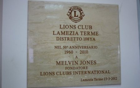 E’ stata inaugurata alla vigilia dell’atteso incontro che si terrà domani pomeriggio a Lamezia Terme, a cura del Lions Club Lamezia Terme – Distretto 108 YA, la targa ricordo che il club lametino, punto di riferimento per l’Italia meridionale, ha voluto offrire al Comune di Lamezia Terme in occasione dei 50 anni di attività. Una targa in marmo donata alla città e dedicata all’impegno di Melvin Jones, il fondatore e padre del Lions Clubs International. Numerose le personalità appartenenti al Distretto della VII Circoscrizione, e che assieme al sindaco Gianni Speranza e al presidente lametino Francesco Muraca, hanno testimoniato l’impegno e la missione nel sociale, propria di un club che da mezzo secolo si batte per i diritti dei meno fortunati. Un club, che a detta del governatore del Distretto 108YA Michele Roperto, <<in questo periodo di crisi che sta cambiando il mondo, quello che ci salva sono i valori della testimonianza illirica. Noi dobbiamo cercare in questi valori e credere nelle cose che facciamo  perché solo così, anche le utopie possono diventare mete raggiungibili>>.