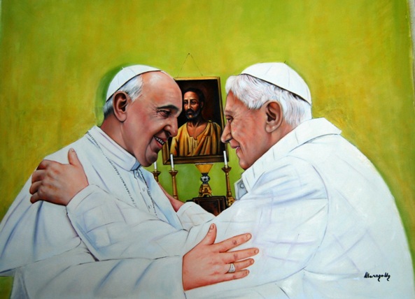 Durante l’udienza l’artista Morogallo ha donato al Papa, una sua opera che raffigura l’abbraccio tra Papa Francesco e Benedetto XVI.