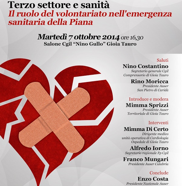 Un incontro dibattito, organizzato dall’Associazione di Volontariato Auser Territoriale di Gioia Tauro e dal circolo Auser di San Pietro di Caridà, dal titolo “Terzo settore e sanità. Il ruolo del volontariato nell’emergenza sanitaria della Piana” si terrà martedì 7 ottobre alle ore 16.30, presso il Salone Cgil “Nino Gullo” a Gioia Tauro. L’iniziativa, che vedrà la partecipazione del presidente nazionale Auser Enzo Costa, sarà un’occasione per discutere sulla preoccupante situazione sanitaria della Piana e sulla funzione dei tanti volontari impegnati in servizi di assistenza alle fasce deboli del territorio.