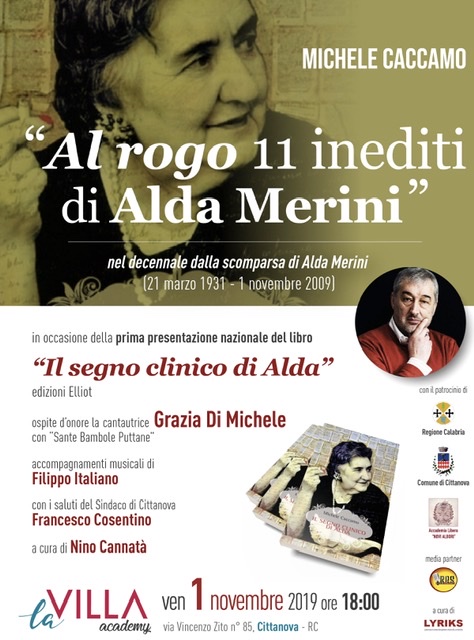“Al rogo 11 inediti di Alda Merini” è la dichiarazione shock del poeta Michele Caccamo (calabrese di origine). La singolare iniziativa avverrà in occasione della prima presentazione nazionale del suo ultimo libro “Il segno clinico di Alda” edizioni Elliot, venerdì 1 novembre 2019 ore 18:00 presso la Villa Academy di Cittanova (RC) nel giorno del decennale della scomparsa della poetessa Alda Merini (21 marzo 1931 – 1° novembre 2009).