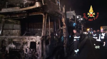 Squadre dei vigili del fuoco del Comando di Catanzaro, distaccamento di Lamezia Terme, con supporto di autobotte, sono intervenute sull’autostrada A2 del Mediterraneo al km 300 direzione Nord tra gli svincoli di Falerna e San Mango d’Aquino per l’incendio di un autoarticolato. Il mezzo interessato dal rogo una motrice con bisarca a due piani specifico per il trasporto di autoveicoli. L’incendio originatosi dalla motrice si è propagato a quattro degli otto autoveicoli trasportati. Sul posto presenti Anas e Polstrada. Terminate le operazioni di spegnimento e messa in sicurezza del mezzo incendiato è stato riaperto al transito il tratto autostradale. Il mezzo era in transito al momento dell’incendio, l’autista è riuscito ad abbandonare la cabina senza riportare alcun danno. La motrice e due delle quattro autovetture trasportate sono andate completamente distrutte. Parziali danni ad altre due vetture mentre intatte le rimanenti quattro.