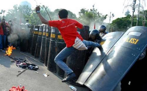La polizia indonesiana ha lanciato lacrimogeni per disperdere decine di manifestanti che sono scesi in piazza a Jakarta nel giorno del primo anniversario del giuramento del presidente Susilo Bambang Yudhoyono.