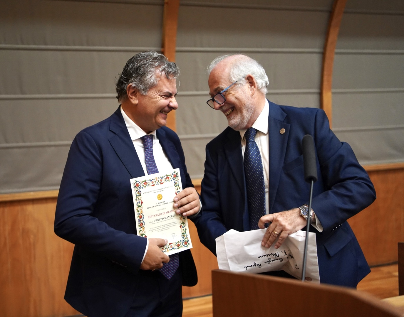 “Per il suo fondamentale impegno nel redigere la legge sull’integrazione delle due Aziende ospedaliere di Catanzaro e per il suo costante supporto alle iniziative culturali dell’Ateneo”. E’ quanto scritto nell’attestato di merito che l’Università degli studi Magna Graecia – attraverso il suo rettore prof. Giovambattista De Sarro – ha conferito al presidente del Consiglio regionale Filippo Mancuso, alla presenza del ministro della Salute Orazio Schillaci, nel corso della cerimonia (per i suoi 25 anni) che si è svolta all’interno di un auditorium gremito.