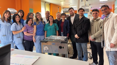 Alla consegna del macchinario erano presenti anche il dottor Gianfranco Scarpelli, direttore del reparto di Neonatologia e Terapia Intensiva Neonatale, la dottoressa Maria Lucente, responsabile dell’Unità di Cardiologia Pediatrica, insieme all’equipe medica del reparto.