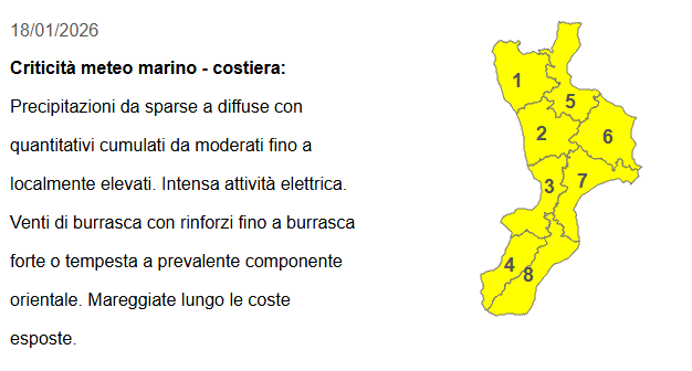 La Calabria si prepara ad affrontare un’imminente ondata di maltempo, i cui primi effetti sono già visibili sul territorio da domani. Le previsioni sono abbastanza preoccupanti in quanto già con l’allerta gialla diramata dalla protezione civile per domani, tale condizioni temporalesca dovrebbe prolungarsi almeno fino a martedì prossimo con piogge torrenziali, mareggiate e forti venti con un sostanziale peggioramento che la Regione dovrà affrontare.