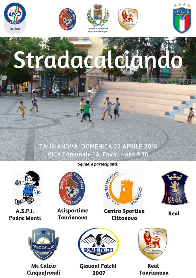 Nel nostro territorio ormai da diversi anni la Delegazione Distrettuale gioiese della Lnd organizza, in sinergia con le società calcistiche, tale manifestazione, coinvolgendo sempre numerosi sodalizi e tanti ragazzi provenienti dai diversi centri della Piana. Nella tappa taurianovese oltre alle due società organizzatrici saranno presenti anche l’Aspi Padre Monti di Polistena, il Centro Sportivo Cittanova, i Giovani Falchi 2007 di Maropati, l’Mc Calcio Cinquefrondi e il Real di Gioia Tauro.