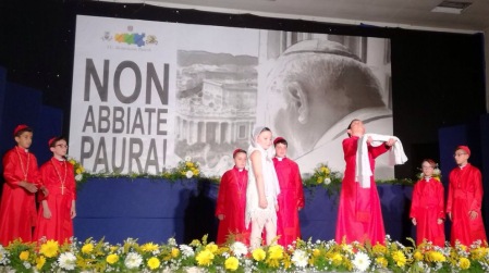 «Non abbiate paura!» racconta le tappe principali della straordinaria vita di Wojtyla. Il linguaggio scelto è quello della semplicità: dall’amore per il teatro al seminario durante l’occupazione nazista, dalla nomina ad arcivescovo di Cracovia alla carriera in Vaticano, fino alla sua elezione a papa, tutto viene raccontato in modo diretto e spettacolare grazie alla scenografia che ha creato un’atmosfera suggestiva, al ruolo preponderante della musica (Ave Maria di Gounod, Volesse il cielo di Mia Martini, Only Time di Enya e tante tante altre), al lavoro attento delle Docenti Teresa Ielo, Rosa Saccà, Maria Greco, Domenica Asciutto, Chiara Chindamo, Pina Gentile e Raffaella Barresi e, naturalmente, alla bravura del cast: ingredienti necessari per uno spettacolo che dosa con equilibrio il sentimento e il rigore del messaggio, affinché la figura del papa venga resa con verità e rispetto. E allora se da un lato si sottolinea quanto i rapporti umani abbiano significato per Wojtyla, dall’altro si lascia spazio all’amore per la Vergine Maria con il suo motto apostolico “totus tuus”.