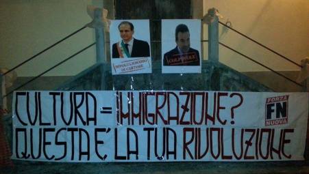 I militanti lametini di Forza Nuova nella notte hanno effettuato un blitz presso l’ex Teatro Russo attaccando due manifesti raffiguranti l’ex sindaco di Lamezia, Gianni Speranza, e quello attuale, Paolo Mascaro, con sovraimpresse due scritte: rispettivamente sul primo “colpevole” mentre sul secondo “rivoluzionario di cartone”, il tutto correlato da uno striscione la cui dicitura recita “Cultura=immigrazione? Questa è la tua rivoluzione”. Con questa azione hanno voluto, ancora una volta, evidenziare il proprio disappunto verso una decisione assunta a suo tempo dalla precedente Giunta Comunale di centrosinistra, che inserì lo storico Teatro Russo in un intervento di recupero allo scopo di cambiarne la normale destinazione d’uso trasformandolo in una casa di accoglienza per famiglie di immigrati. Dopo oltre un anno dalla presentazione del progetto, finanziato con Fondi Fesr, il tutto ora, sotto l’egida della Giunta Mascaro, si sta concretizzando senza che lo stesso sindaco abbia mai manifestato segnali di opposizione a tutto ciò. Da qui l’ avversione politica di Forza Nuova verso questo esecutivo di centrodestra e verso il sindaco Mascaro,che rappresenta la perfetta continuità amministrativa di chi l’ha preceduto. Quanto sembrano lontane le urla e gli slogan della campagna elettorale della scorsa primavera, quando lo stesso attuale primo cittadino si ergeva ad autentico rivoluzionario per la città,colui che avrebbe cambiato volto a Lamezia Terme. Ovviamente, a noi di Forza Nuova, questo non stupisce e cominciamo però nel provare una sorta di idiosincrasia, alla stessa stregua di molti cittadini ormai,rispetto alle stucchevoli giustificazioni portate da consiglieri di maggioranza ed assessori della Giunta,relativamente alla situazione debitoria che gli stessi hanno rilevato al Comune, ed alle manovre, alle quali affermano di dover ricorrere per forze di cause maggiori. Una “vexata quaestio” ,ormai, quella relativa alle casse comunali, infatti dall’operato della Giunta Mascaro in questo primo scorcio di consiliatura, non abbiamo riscontrato alcuna rottura col passato,e la vicenda dell’ex Teatro Russo ne costituisce una ulteriore conferma.