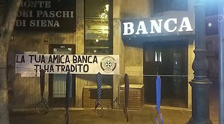 “La tua amica banca ti ha tradito”. Uno striscione e tante cravatte annodate a simboleggiare “il cappio messo al collo dei risparmiatori dagli usurai in doppiopetto” sono comparsi nella notte davanti alla filiale della banca Monte dei Paschi di Siena a Lamezia Ovest e nelle filiali di tutta Italia degli istituti di credito sottratti al fallimento dal ‘Salvabanche’, ma anche di Mps, Antonveneta e Veneto Banca. A rivendicare l’azione choc è CasaPound Italia.