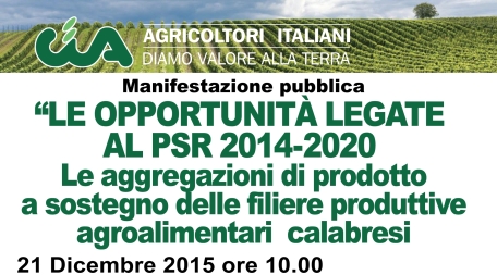 Lunedì 21 Dicembre, al teatro del Centro Agroalimentare della Fondazione Terina di Lamezia Terme, la Confederazione Italiana Agricoltori della Calabria, alla presenza, tra gli altri, del Presidente della Giunta regionale Mario Oliviero, del Consigliere regionale Mauro D’Acri, del Presidente regionale Nicodemo Podella e del Presidente nazionale Secondo Scanavino – a cui sono affidate le conclusioni – si interrogherà sul percorso virtuoso che l’agroalimentare calabrese è chiamato a programmare a seguito dell’approvazione del Programma di Sviluppo Rurale 2014-2020 e sulla necessità di promuovere e organizzare filiere economiche e produttive per migliorare la competitività del made in Calabria, in Italia e nel mondo e per aumentare il reddito degli agricoltori.