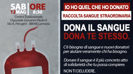 Lamezia – Si svolgerà sabato 12 maggio, la raccolta straordinaria di sangue organizzata dal circolo Identità Nazionale. “Io ho quel che ho donato’’, questo il nome dell’iniziativa, porterà i volontari la mattina dalle ore 8:30 alle ore 12:00 presso il centro trasfusionale dell’ospedale di Lamezia Terme, per compiere un concreto gesto di solidarietà. Fra i promotori di questo evento, c’è anche l’ex consigliere comunale ed esponente di Fratelli d’Italia *Mimmo Gianturco* il quale dichiara: “Sabato effettueremo il più concreto atto di solidarietà che si possa compiere, donare noi stessi. Invito i lametini a partecipare numerosi in quanto c’è sempre bisogno di sangue e di nuovi donatori, per aiutare veramente chi ha bisogno”.