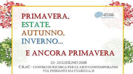 Il 22 e il 23 giugno l’Associazione per la Ricerca Neurogenetica onlus (ARN) sarà presente al Centro di Ricerca per le Arti Contemporanee (CRAC) di Lamezia Terme con la mostra “Primavera, Estate, Autunno, Inverno… e ancora Primavera”. L’esposizione raccoglie le opere realizzate dagli ospiti che frequentano la Casa accogliente Alzal (centro diurno per persone affette da demenza, creato nel 2001 e gestito dall’ARN), durante l’omonimo progetto portato avanti da Valentina Margiotta e Antonella Raso. L’evento è diviso in due giorni: il pomeriggio del 22 è dedicato ad una visita guidata speciale per gli “artisti”, gli amici del TeneraMente Alzheimer Cafè, e i loro familiari, mentre il 23 la mostra sarà aperta al pubblico dalle 16:30. Sempre il 23, alle 19 si terrà il workshop “l’Arte che si prende cura”, al quale interverranno, oltre ad Antonio Laganà, presidente ARN, la dott.ssa Emilia Mezzatesta, direttrice della scuola di arteterapia “Artedo”, la prof. ssa Amalia Bruni, direttrice del Centro di Neurogenetica (CRN), l’artista Maurizio Carnevali, Valentina Margiotta e Antonella Raso, le ideatrici del progetto e arteterapeute in formazione. L’evento è stato possibile solo grazie alla sinergica collaborazione di chi ha deciso di partecipare fattivamente alla sua organizzazione. Si ringrazia: le operatrici e i ragazzi del Servizio Civile di Casa Alzal, Nicoletta Grasso che ci ospita nel suo CRAC, Artedo (unico ente di arteterapia riconosciuto dal MIUR), Maurizio Carnevali, Baglione Piante, e naturalmente tutti coloro che parteciperanno.