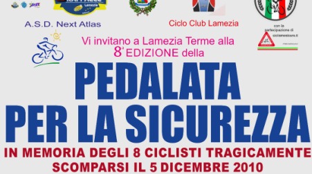 Si svolgerà domenica 11 novembre a Lamezia l’ottava edizione della “Pedalata per la Sicurezza”, la manifestazione sportiva su due ruote che ha l’intento di ricordare gli otto ciclisti lametini morti tragicamente il 5 dicembre del 2010 lungo la strada statale 18. Ad organizzare l’evento, la Raffaele Lamezia Next Atlas, il Ciclo Club Lamezia e l’ASD Lamezia Bikers, con il patrocinio del Comune di Lamezia Terme e la partecipazione di Ciclismo Sicuro. Tutti sono invitati a partecipare: grandi e piccoli, purché dotati del casco. Si tratta, infatti, di una pedalata cittadina a velocità controllata dedicata ai bambini e a tutti coloro che amano pedalare. L’appuntamento è per l’11 novembre in Piazza 5 Dicembre: alle 8.30 il raduno e alle 9.30 la partenza. Percorso Under 12: KM 3; Percorso Over 12: KM 25.