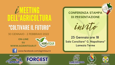 Oggi 25 gennaio presso la sala Consiliare del comune di Lamezia Terme sarà presentato il meeting: ” Coltivare il futuro”, quattro giorni dedicati all’ agroalimentare e alle sfide che l’agricoltura dovrà sostenere nel prossimo futuro in termini di innovazione digitale, tutela della biodiversità, sostenibilità ambientale .