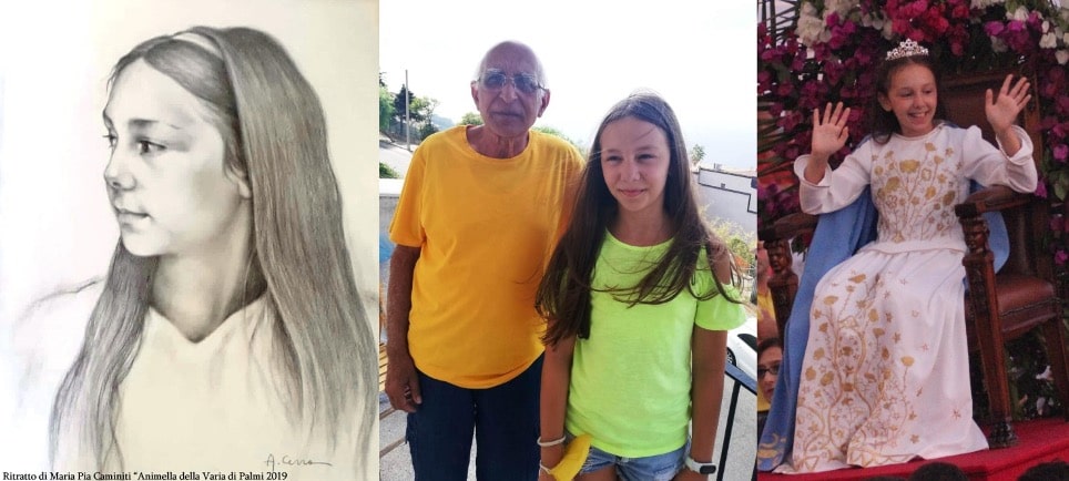 L’artista Antonio Cerra ha ufficialmente donato a Maria Pia Caminiti, bambina che ha simboleggiato la Madonna Assunta in cielo, “Animella della VARIA DI PALMI 2019” , un ritratto realizzato l’anno scorso durante i festeggiamenti. Antonio Cerra nato a Lamezia Terme nel 1943 ha trascorso l’infanzia e la giovinezza a Palmi. Fin dall’adolescenza, avendo attitudine al disegno, frequenta lo studio dello zio Felice Cerra, pittore e decoratore, presso il quale affina tale predisposizione e riceve lezioni di pittura, applicandosi nell’esecuzione di copie di grandi Maestri. Nel 1969 consegue a Roma il diploma di disegnatore: esegue delle scenografie, realizza illustrazioni e si specializza nel disegno botanico e naturalista. Nel 1970 si trasferisce definitivamente a Firenze e lavora come disegnatore presso l’Istituto Geografico Militare. Ha partecipato a numerose mostre collettive in Italia e all’estero allestendo mostre personali in svariate città, conseguendo significativi riconoscimenti e premi di rilievo. In agosto del 2020 espone alla Mostra collettiva “Mettiti in Mostra” presso il Polo Museale – Palazzo Grillo di Oppido Mamertina. Evento realizzato da Maria Colella, con il patrocinio del Comune di Oppido Mamertina ed in collaborazione con: Centro d’Arte e Cultura Bruzio di Gioia Tauro (RC), Associazione Culturale Musicale “S. Johannes – Palmi (RC), Associazione Culturale “Ritrovarsi nell’archetipo” di Gioia Tauro (RC) e la Biblioteca Comunale di Oppido Mamertina. Tra le opere esposte dall’artista Antonio Cerra salta all’occhio dei quasi 2000 visitatori e da critici d’arte il ritratto dell’animella della Varia di Palmi 2019 – Maria Pia Caminiti. Legato sin da piccolo alla città di Palmi, Cerra ha deciso di donare alla fanciulla il ritratto con particolare dedica: “ A Maria Pia animella della Varia di Palmi 2019 con stima, affetto e per la bravura ad interpretare il ruolo di Animella con dolcezza e tantissima fede. Che la Madonna ti assista nel tuo percorso e nel tuo avvenire – ANTONIO CERRA ”