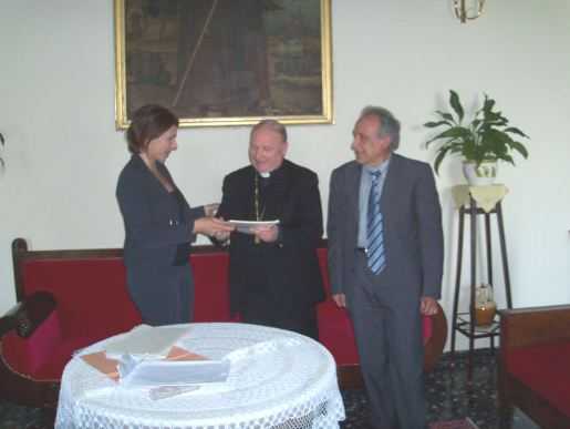 COSENZA – In un clima sobrio, di grande cordialità, si è svolto un incontro fra l’AMI.BE.C. (associazione culturale “Amici beni culturali”) e mons. Leonardo Bonanno, vescovo della diocesi di San Marco Argentano-Scalea. Eletto vescovo dal Santo Padre il 7 gennaio del 2011, mons. Bonanno è stato ordinato sacerdote il 27 giugno del 1971. Si è distinto per la sua umanità, per una naturale capacità di ascolto e per una chiara propensione ai temi della cultura e dell’educazione. Nel corso dell’incontro Lia Turano, responsabile AMI.BE.C. Calabria, ha consegnato a mons. Bonanno la rassegna stampa relativa al messaggio augurale dell’associazione indirizzato al prelato in occasione della sua nomina.